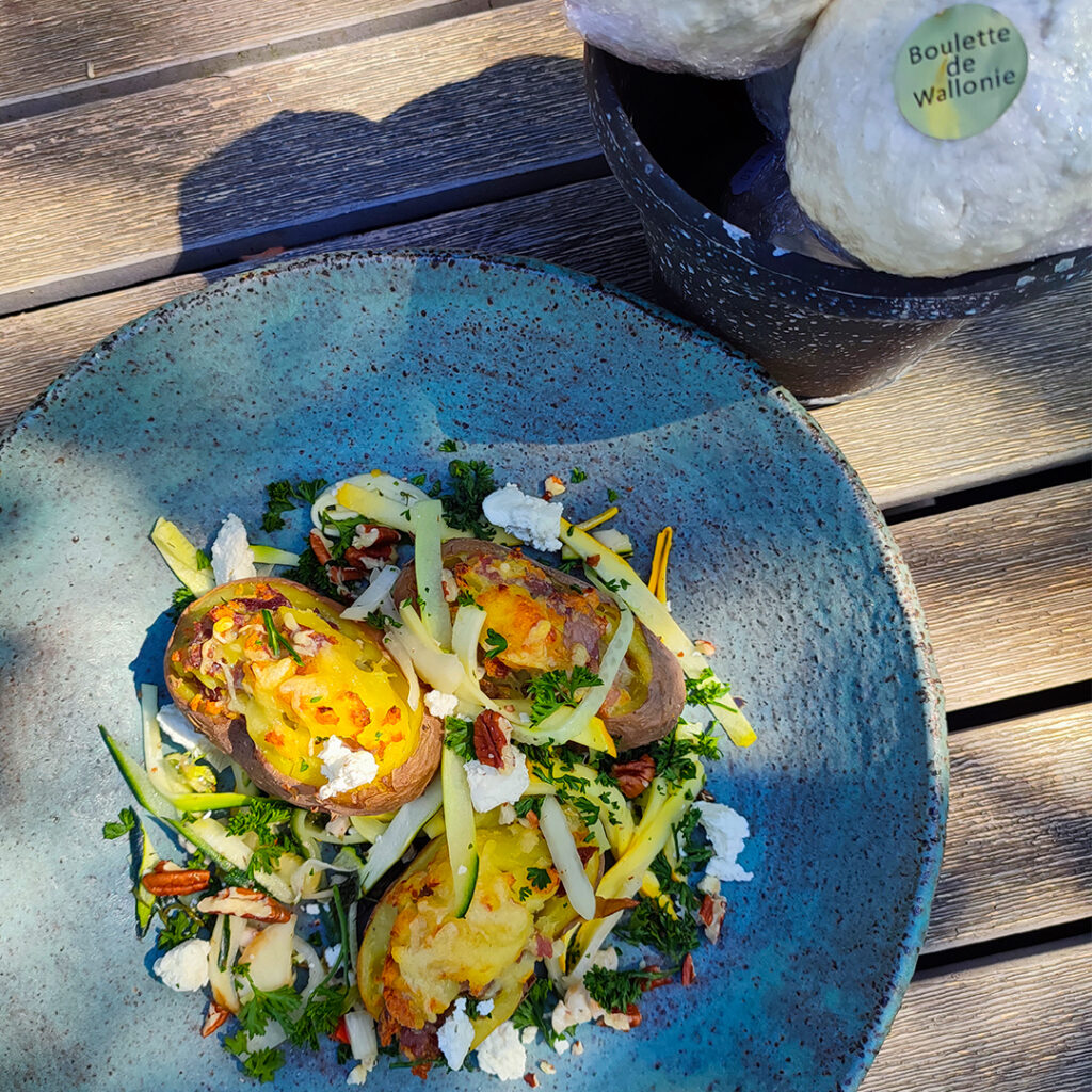 Pomme de terre Macaire à la Boulette de Wallonie et julienne de légumes